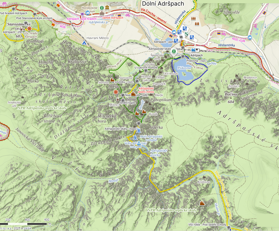 Po prehliadke Teplických skál treba prejsť Vlčou roklinou (po žltej značke) do Adršpašských skál a tam pokračovať v prehliadke.