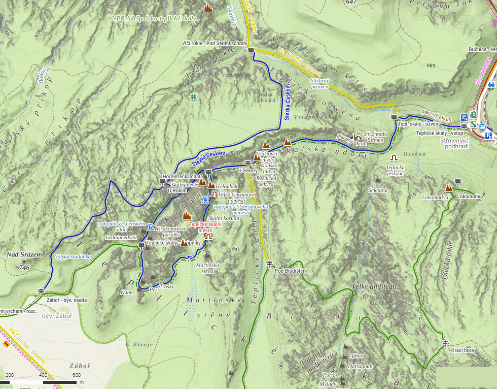 Trasa : Teplické skaly, vstup – Vyhliadka a ozvena - zrúcanina hradu Střmen – Skalná brána – skalný útvar Sekera – skalná veža Hláska – rázcestie u chaty Skalná nevesta – Veľké chrámové námestie – Skalná kaplnka – Skalná koruna – Chrám – skalný útvar Sfinga – skalný útvar Herínek – skalný priechod – rázcestie pod Krakonošovým parátkom - skalný útvar Ľadový medveď – skalná roklina Sibír – Skalná brána – výstup zo skál.