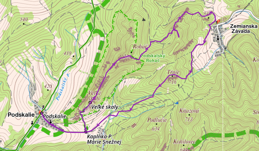 Trasa : Podskalie - Kaplnka Panny Márie Snežnej - Veľké skaly – Podskalský roháč – Malá a Veľká Temná jaskyňa – Zemianska Závada – Tŕnie - Kaplnka Panny Márie Snežnej - Podskalie.