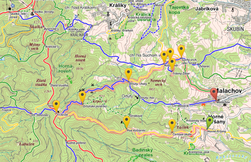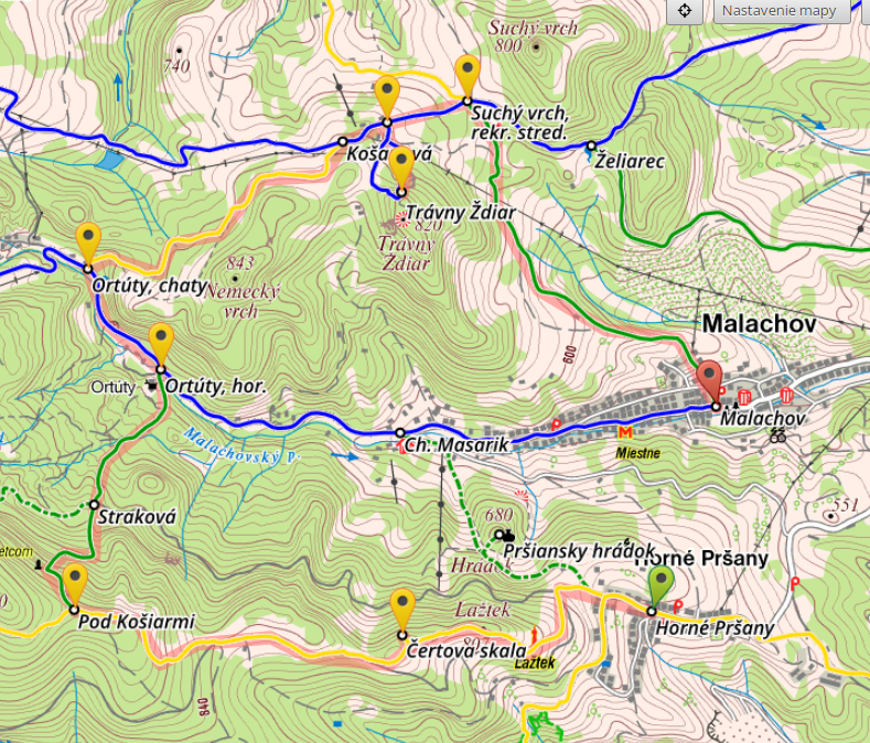 Trasa A: .Horné Pršany - rozhľadňa Lažtek - Čertova skala - Pod košiarmi - Straková - Ortúty (horáreň) - Ortúty (chaty) - Košanová - Trávny Ždiar - Suchý vrch (rekr. stredisko) - Malachov.