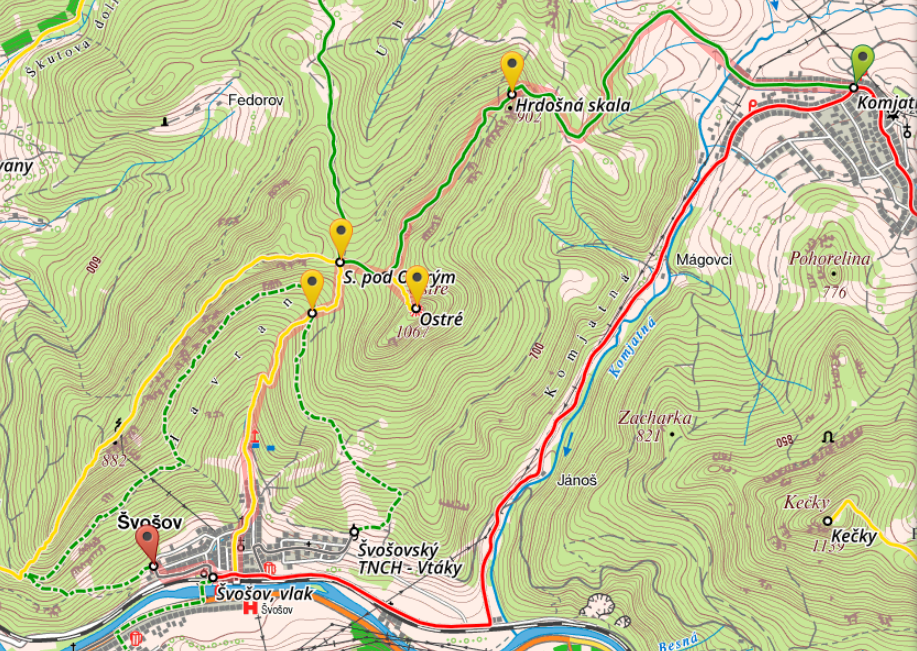 Trasa 2: Komjatná - Hrdošná skala - Ostré, odbočka - Ostré - sedlo pod Ostrým - náučný chodník (popod Havran) - Švošov.