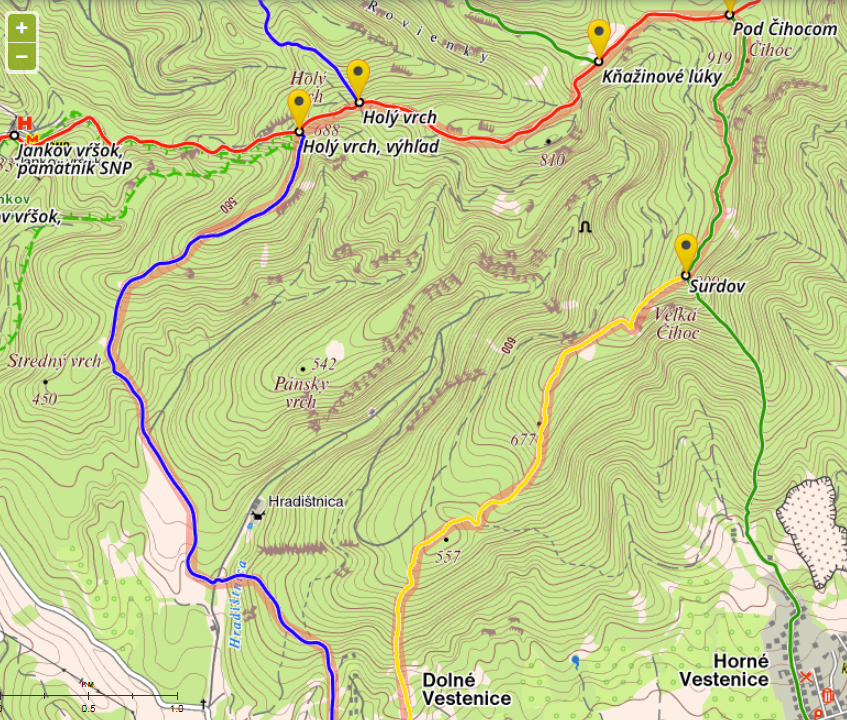 Trasa : Dolné Vestenice - dolina Hradištnica - Medvedia jaskyňa - Kňažinové lúky - Pod Čihocom - Surdov - Veľká Čihoc - dvojkríž - Dolné Vestenice.