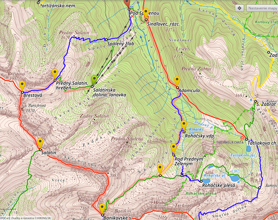 Trasa : Pod Spálenou (štart lanovky) - lanovkou hore - Salatínska dolina - Predný Salatín, hrebeň - Brestová - Salatín - Skriniarky - Spálená - Pachoľa - Baníkovské sedlo - Pod Hrubou kopou - Pod Predným Zeleným - Roháčsky vodopád - Adamcuľa - Šindľovec - Pod Spálenou (štart lanovky).